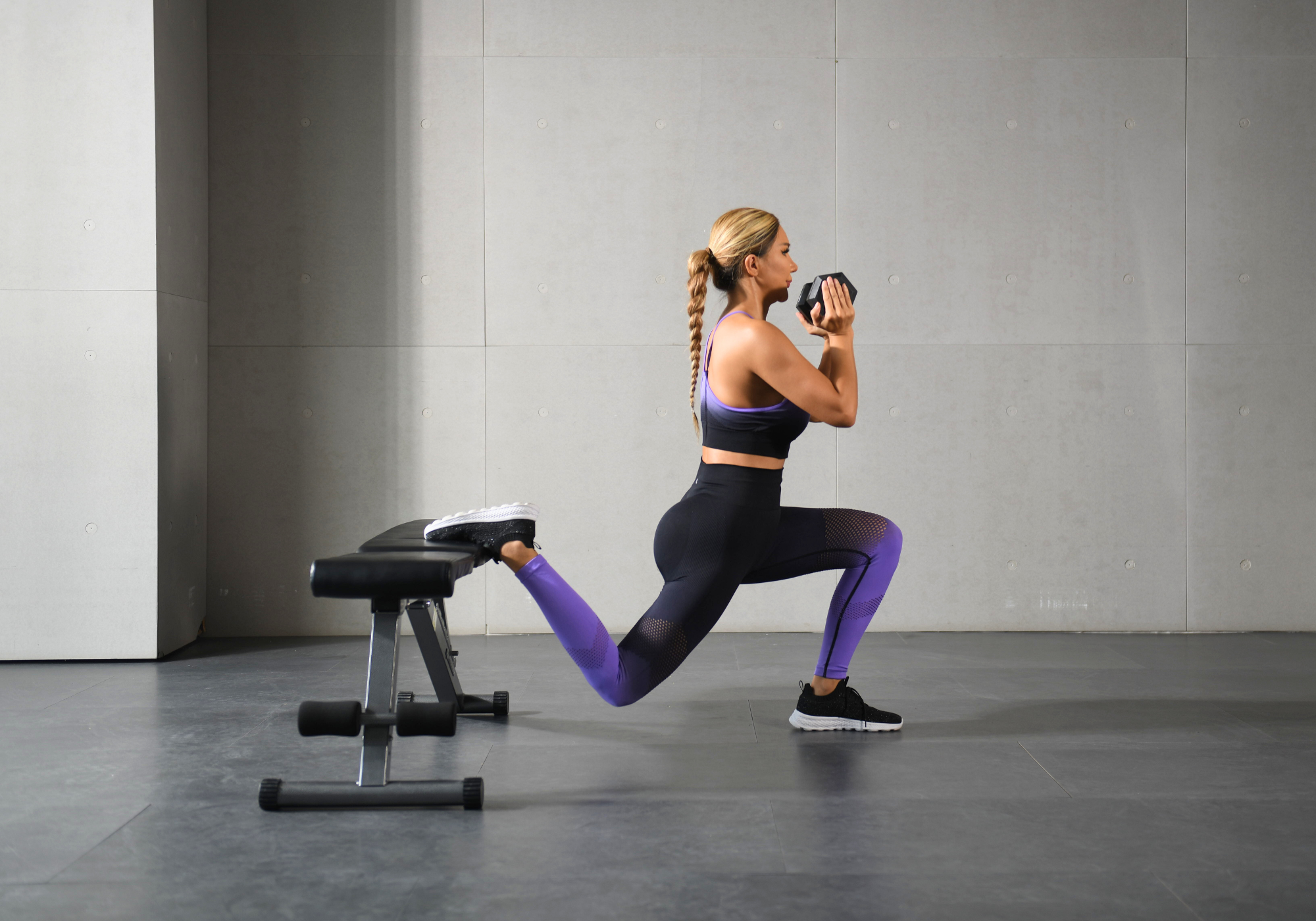 When the 5-in-1 bench is folded, it measures 33.5 inches tall, 13 inches wide, and 11 inches deep. When it is fully extended and flat, it measures 41.3 inches wide, 17.5 inches tall, and just over 48 inches long. With the seat in its highest position, the 5-in-1 bench is 49.6 inches high.