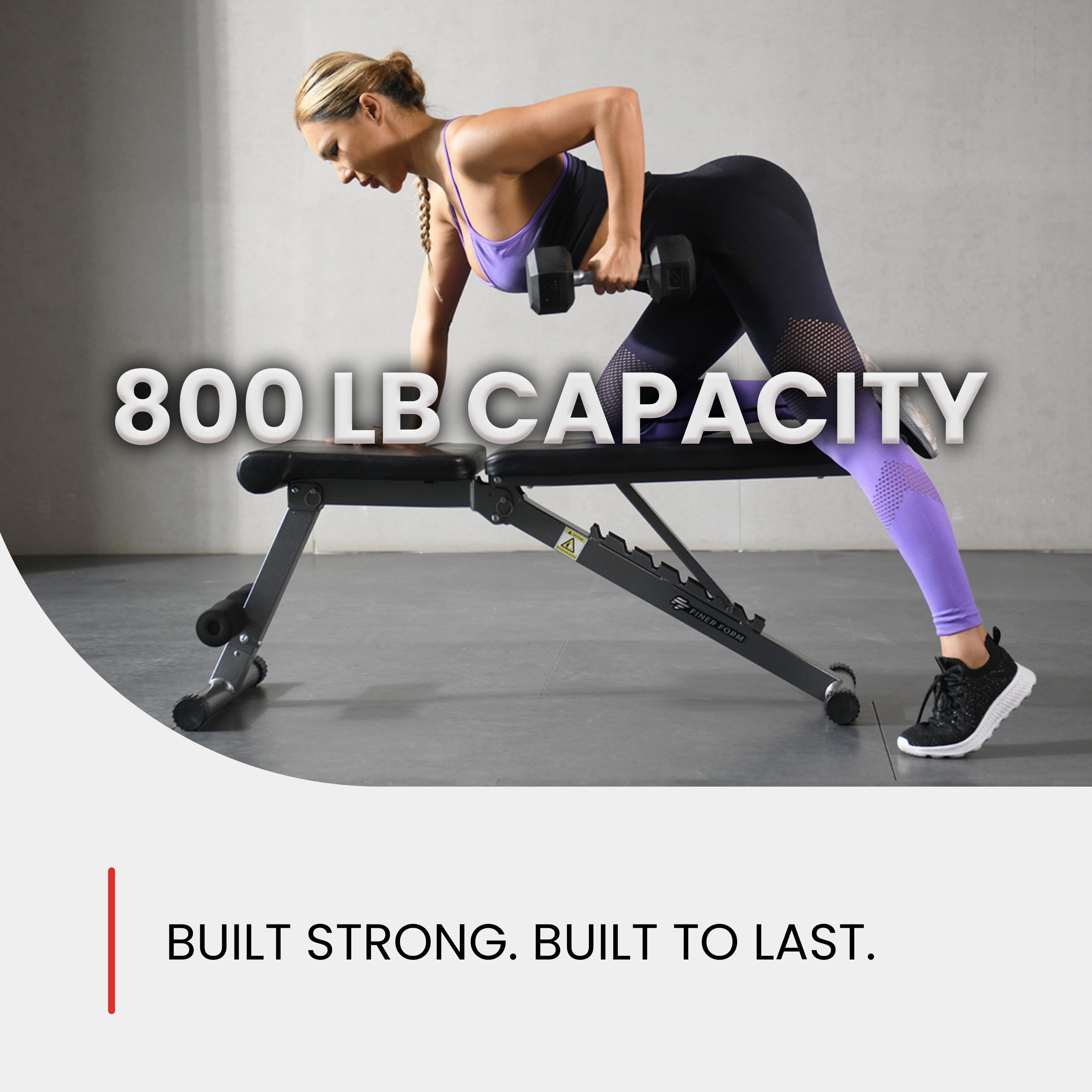 When the 5-in-1 bench is folded, it measures 33.5 inches tall, 13 inches wide, and 11 inches deep. When it is fully extended and flat, it measures 41.3 inches wide, 17.5 inches tall, and just over 48 inches long. With the seat in its highest position, the 5-in-1 bench is 49.6 inches high.