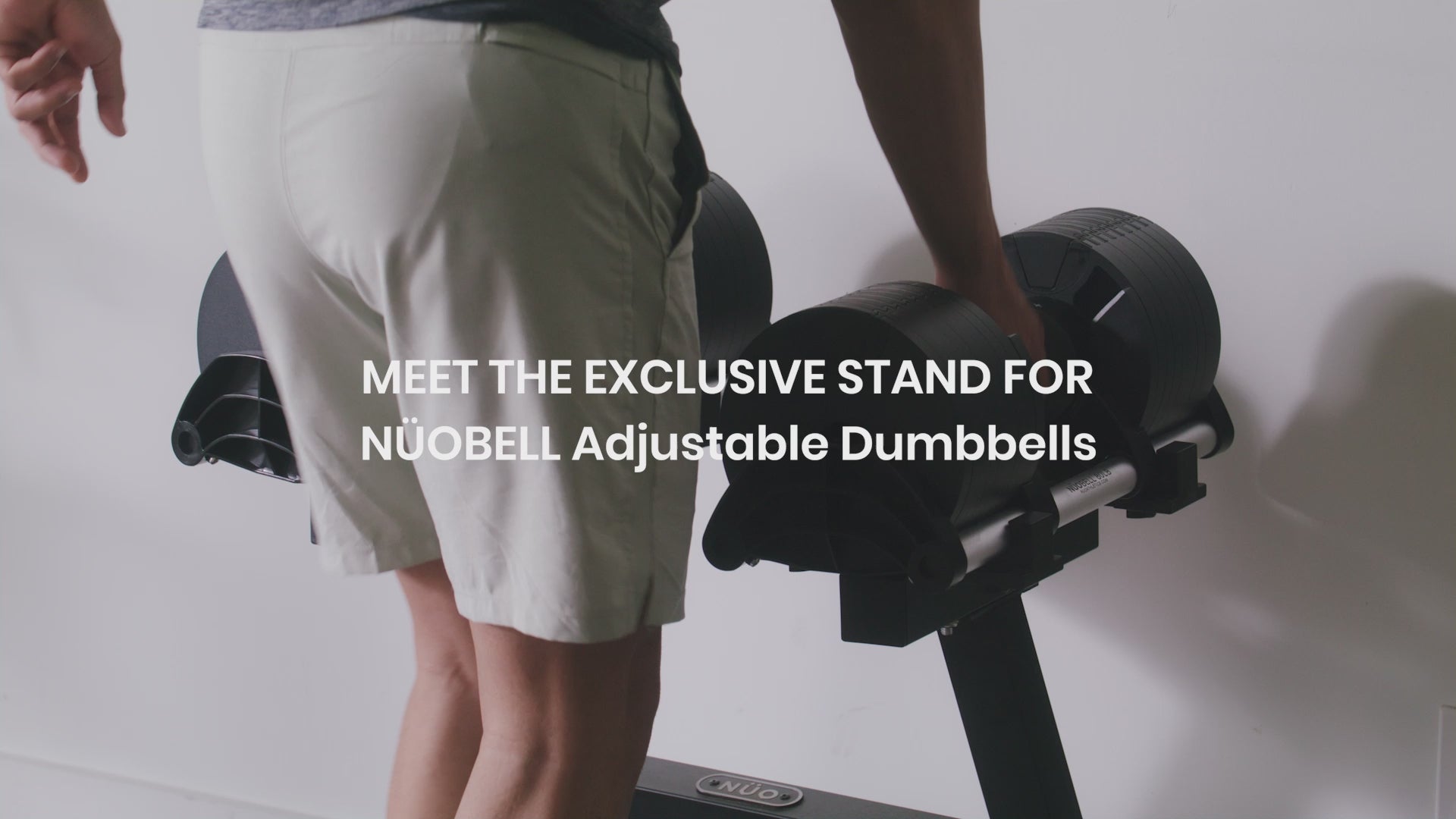 The bundle includes a pair of Nuobell adjustable dumbbells (each adjustable from 5 to 80 lbs) and a matching stand for organized storage.